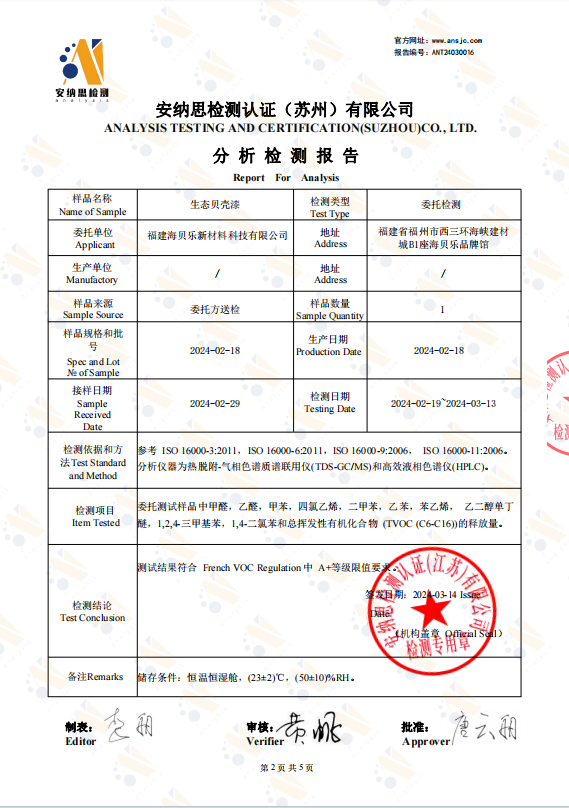 海貝樂無機生態(tài)貝殼漆采用煅燒貝殼粉為原料,國家級專利技術(shù),解決了煅燒貝殼粉(氫氧化鈣)制漆很快沉淀、分水、硬坨的世界性技術(shù)難題,僅使用清水粘合,不添加有機粘合劑。在本次法國A+認證中,海貝樂無機生態(tài)貝殼漆的揮發(fā)性有機化合物釋放物(7天內(nèi))諸如甲醛、乙醛、甲苯等均呈未檢出狀態(tài),高規(guī)格超越標(biāo)準(zhǔn)完成法國A+認證,真正做到無甲醛無毒無刺激。