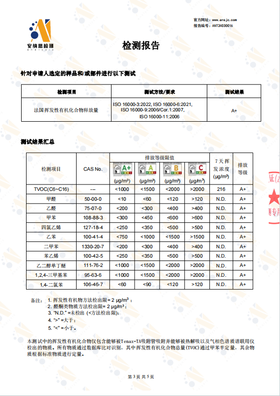 法國A+認證是歐洲環(huán)保等級最高的標(biāo)志,也是法國VOC標(biāo)簽環(huán)保等級最高的標(biāo)志。法國VOC標(biāo)簽(即émissions dans l'air intérieur),是室內(nèi)建筑進入法國市場強制使用的環(huán)保標(biāo)簽,該標(biāo)簽依據(jù)ISO16000標(biāo)準(zhǔn),對產(chǎn)品28天內(nèi)排放的總揮發(fā)性有機化合物的濃度及另外十種常見的對人體有危害的有機化合物濃度進行測試和評級。法國VOC標(biāo)簽共分為A+、A、B、C四個等級,其A+認證是法國VOC標(biāo)簽環(huán)保等級最高的認證標(biāo)志,該認證產(chǎn)品需滿足:TVOC<1000(ug/m3)、甲醛<10(ug/m3)、乙醛<200(ug/m3)。